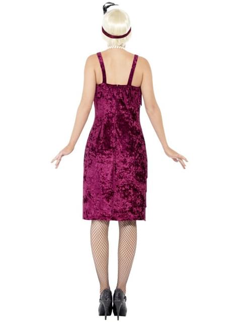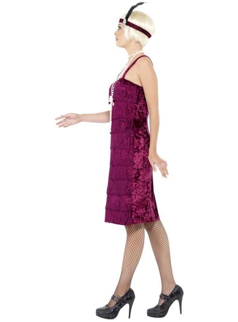 Includes a maroon 1920s dress with fringe and a headpiece.