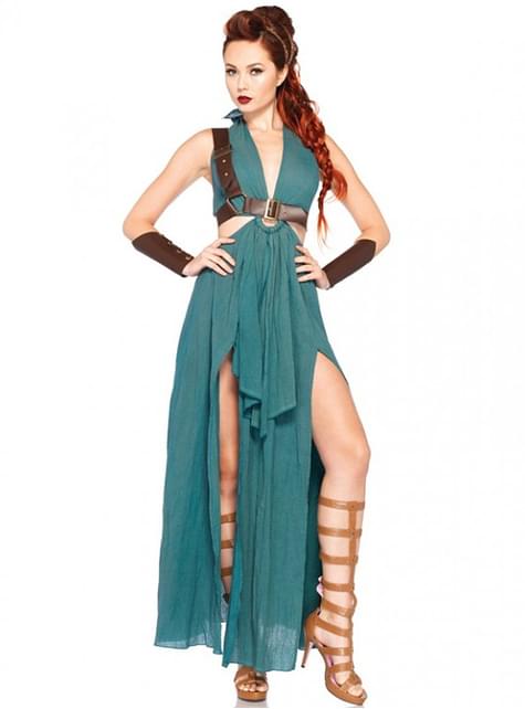 This costume includes warrior maiden, includes cotton halter dress, shoulder harness, headband, and matching wrist cuffs.